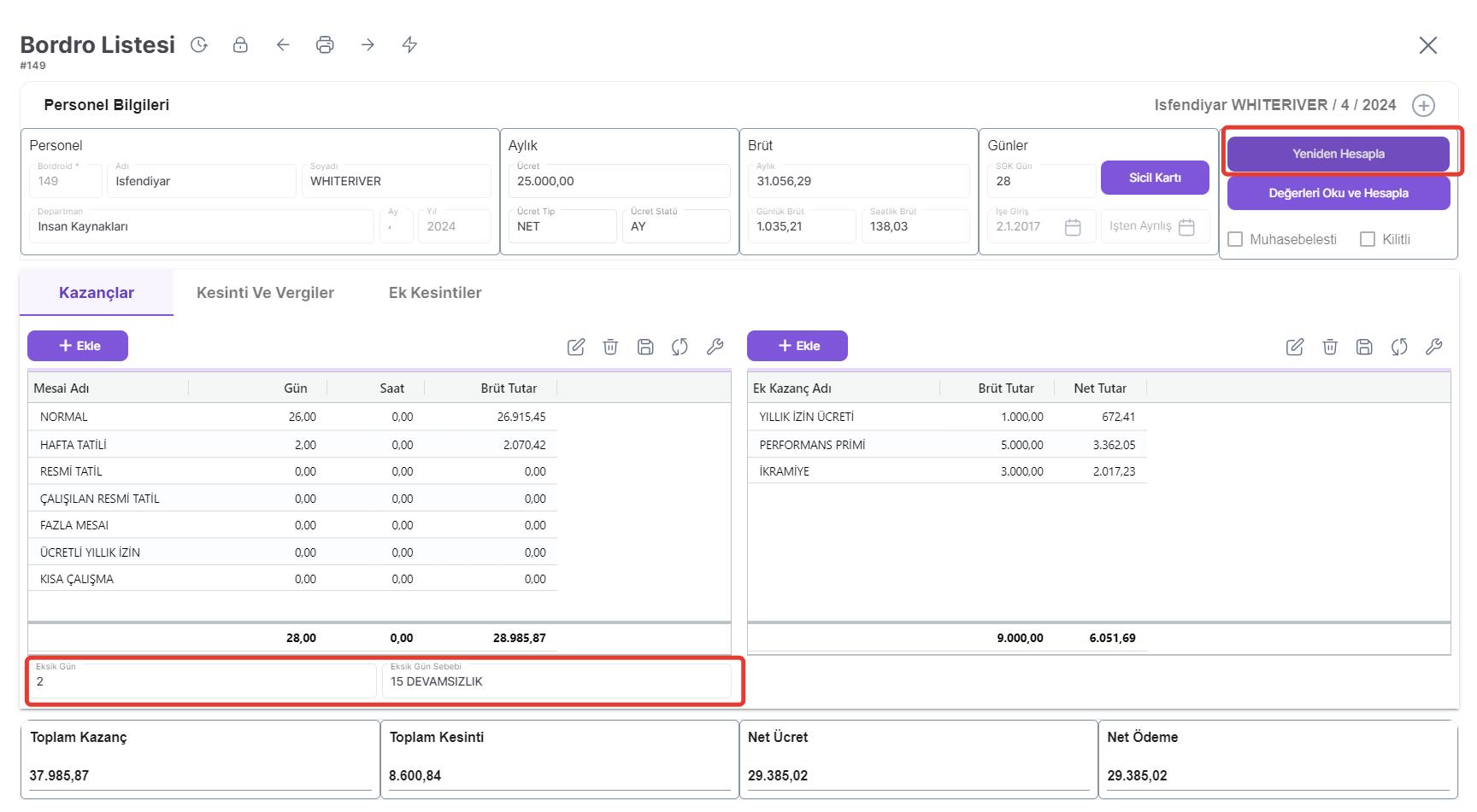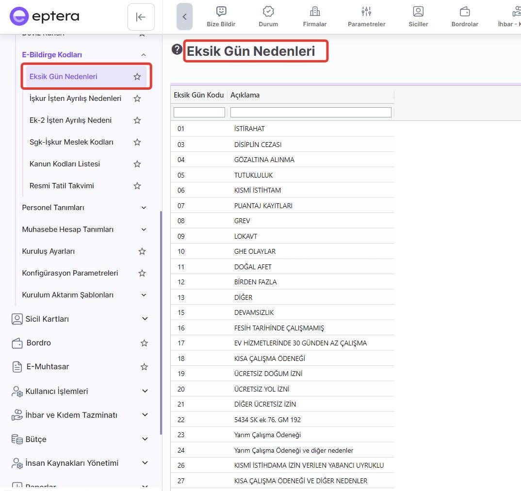 Şirketinizde 30 günden az çalışmış personellerin SGK’ ya bildiriminde kullanılan eksik gün kod ve adlarının listelendiği alandır. Örneğin, eksik gün çalışması olan personelin bordrosu hesaplanırken eksik gün sayısı yazılıp, normal gün sayısından düşülerek bordro hesaplaması yapılır. (bknz Görsel2)