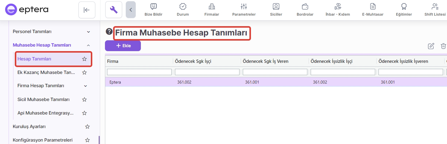 Şirketinizde oluşturulmuş tüm bordrolara ait tutarların muhasebe entegrasyonunda aktarılacağı hesapların tanımlandığı alandır. Açılan satıra tanım yapılacak olan firma seçilerek, ilgili değerlerin takip edileceği hesap kodları girilerek kaydedilir. (Entegrasyon işleminin yapılabilmesi için ilgili döneme ait bordroların oluşturulmuş olması ve tanımlanan hesap kodlarının hesap planında açılmış olması gerekmektedir.)