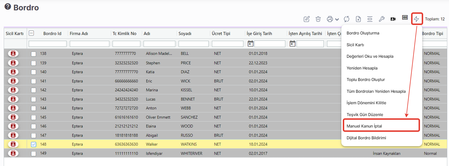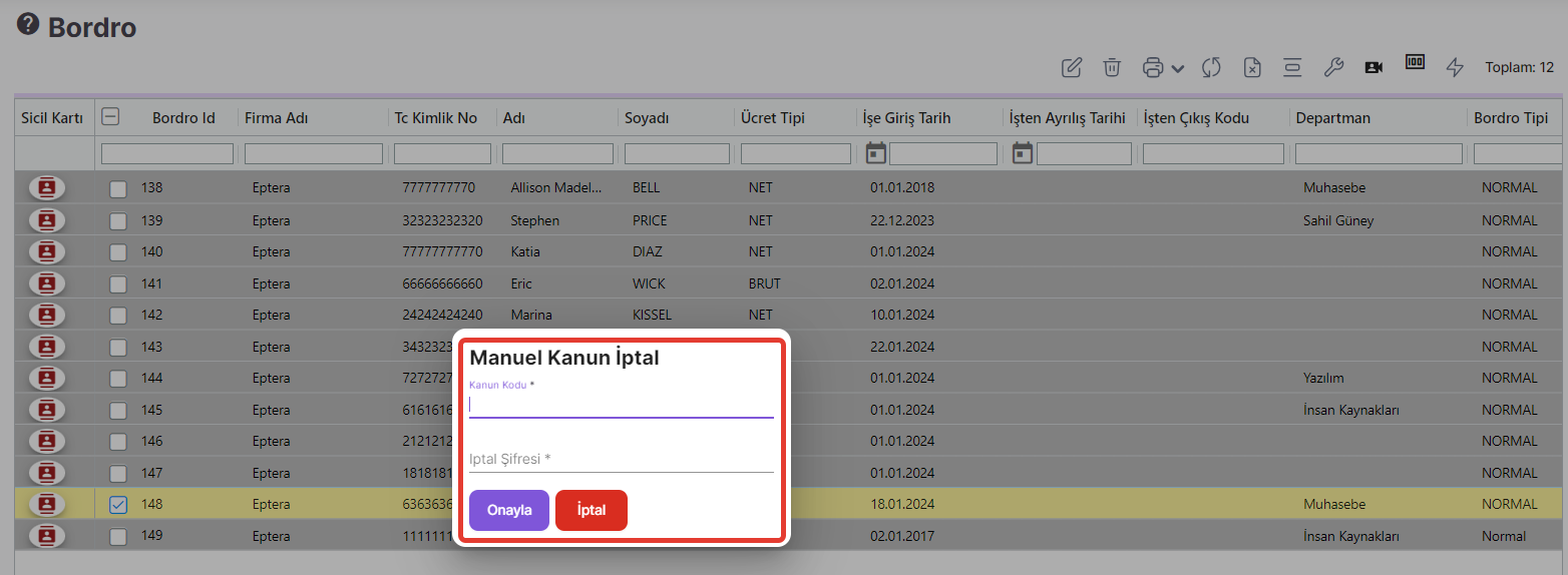 Oluşturulmuş bordrolarda kanun iptali yapmak için kullanılacak şifre belirleme alanıdır. Bordro menüsünde işlemler içerisinden manuel kanun iptal butonu ile seçilen bordrolarda kanun iptali için sistem tanımlanan şifreyi girmenizi isteyecektir. (bknz 2.görsel) Şifre girilmediğinde sistem kanun iptaline izin vermeyecektir.