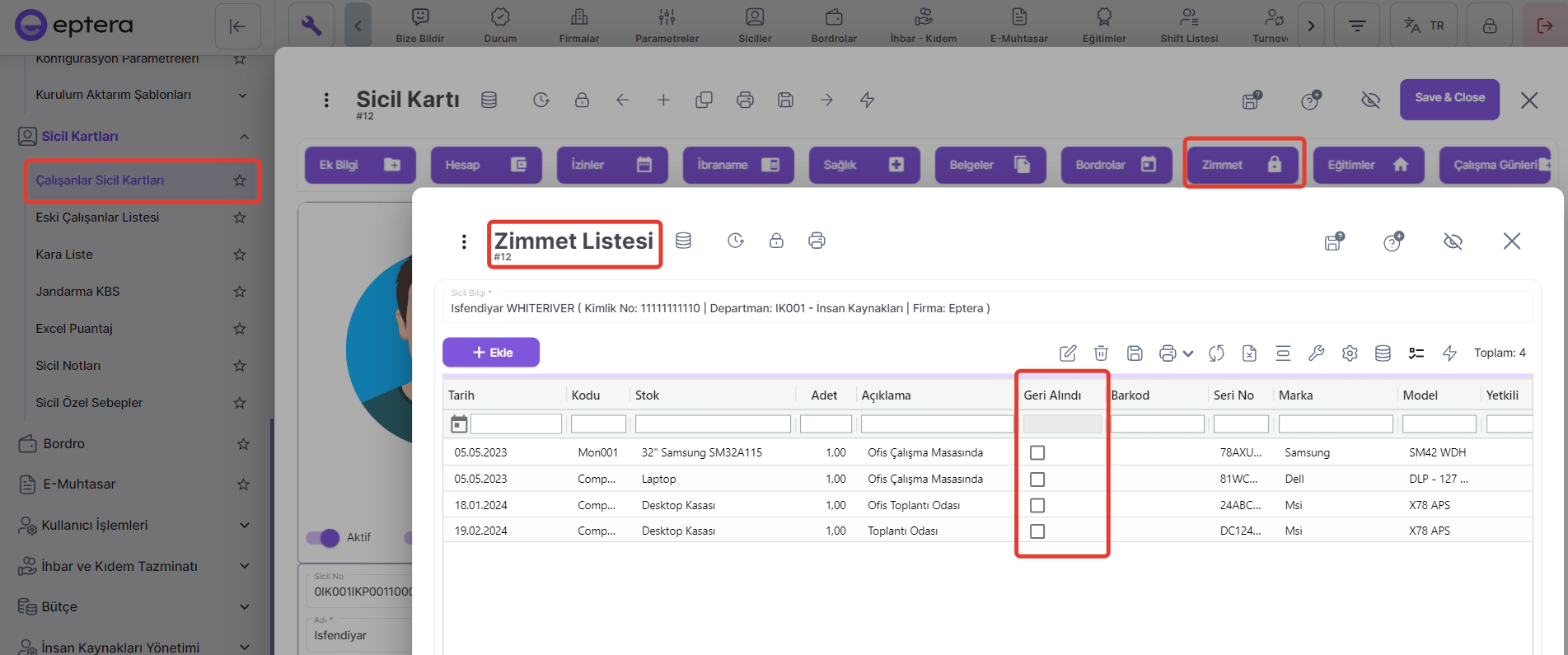 Parametre aktif edildiğinde personele ait zimmet sicil kartı içerisinde (bknz. 2. görsel) geri alındı olarak işaretlenmedi ise sistem ilgili personel için çıkış yapılmasına izin vermeyecektir.
