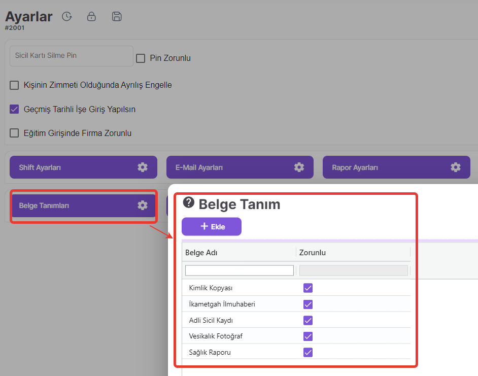 Özlük dosyaları ve işe giriş bildirgeleri için personelden alınacak olan belgeler açılan satıra belge adı yazılarak kaydedilir. Personelden alınması zorunlu belgeler için zorunlu alanı işaretlenerek işlem tamamlanır.