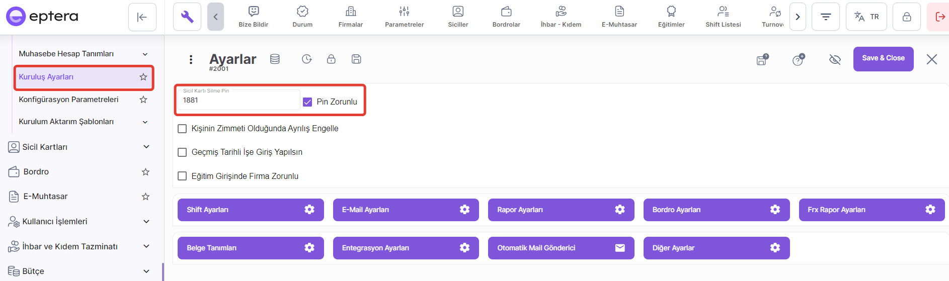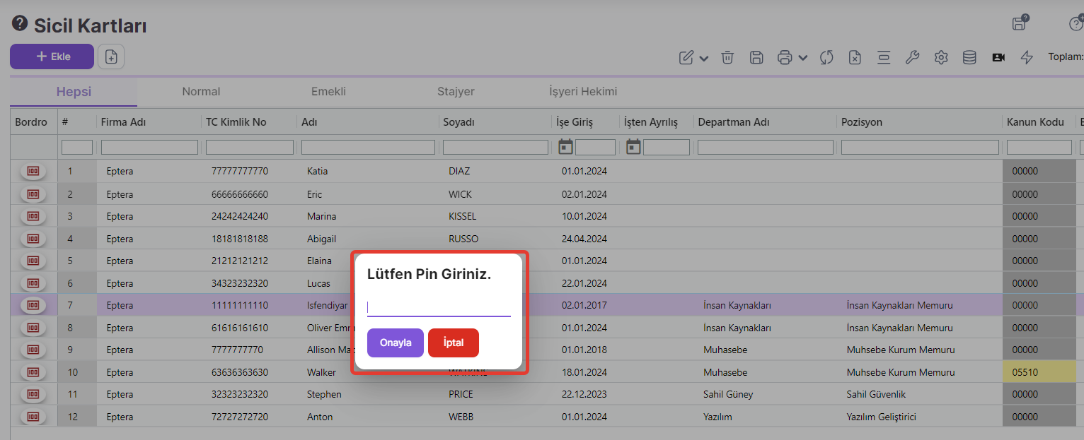 Parametre aktif edildiğinde, sicil kartı silme işlemleri için pin kodu oluşturmanız istenir. Sicil kartı silme işleminde sistem tarafından belirlenen pin kodunun girilmesi istenir. Pin girilmediğinde sistem silme işlemine izin vermeyecektir.