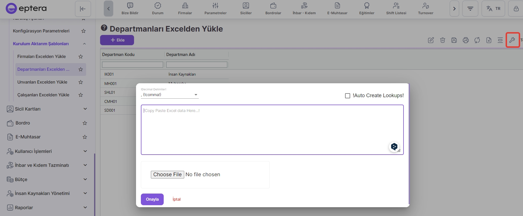 Bu pencerede menüde excel formatı indirilerek, kolon başlıklarında değişiklik yapılmadan gerekli alanlar doldurulur. Excelden yükle butonu ile bilgiler sisteme yüklenerek kaydedilir. Manuel olarak giriş yapmak için açılan satıra departman kodu ve adı tanımlanarak kaydedilir.