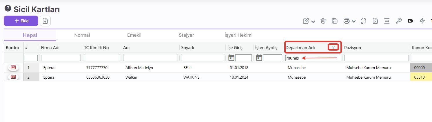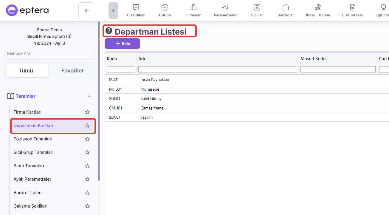 İşletmenizdeki personellerin çalıştığı bölümler buraya kaydedilir. Örneğin; insan kaynakları, pazarlama, resepsiyon, finans, muhasebe gibi." Ardından "Sicil Kartları" ekranında departman adıyla filtreleme yapılabilir (Örneğin; sadece muhasebe departmanındaki çalışanlarınızı görebilirsiniz. bknz Görsel 2). "Raporlar" ekranından ise departman bazında filtreleyip, bordro raporlarını veya sicil raporlarını burada tanımladığımız kod ve adlarına göre görüntüleyebilirsiniz.