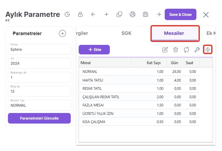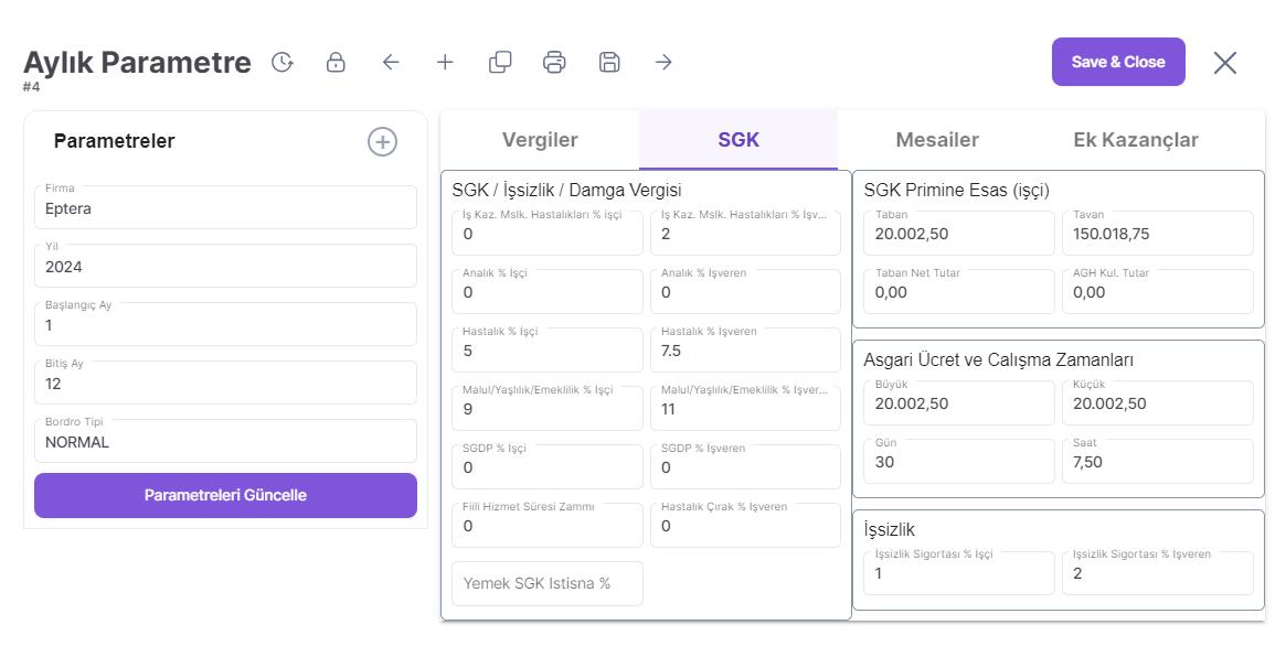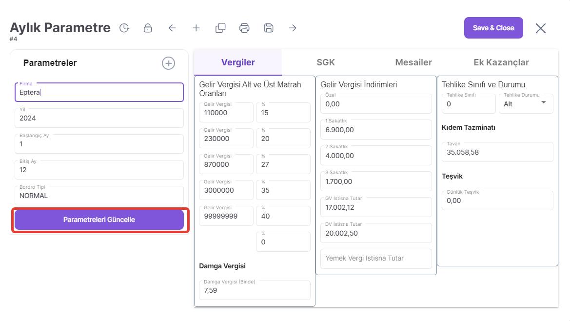 Parametrelerin tanımlanacağı firma, yıl, parametrenin başlangıç-bitiş ayları ve bordro tipi seçilerek parametreleri güncelle butonuyla ilgili yıl ve bordro tipi için parametreler otomatik olarak kaydedilir. Normal ve emekli bordro parametreleri otomatik olarak alınır. Vergiler sekmesinde ilgili yılın, ilgili bordro türüne ait, gelir vergisi dilimleri ve oranları, ilgili yıla ait engelli indirim tutar ve oranları, kıdem tazminatına ilişkin tavan tutarı bulunur. Tehlike sınıf ve durumu da ilgili alanda tanımlanır. SGK adımından kesinti oranları ve ilgili yıla ait SGK ’nın belirlediği taban- tavan ücretlerinin tanımlandığı alandır. Mesailer adımından çalışma günlerinizi ve katsayılarını belirleyebilirsiniz. Oluşturulan parametrelere, standart puantajlar girilerek, bordro oluşturma tarihini içeren parametrelerden otomatik olarak gün sayıları bordroya işlenebilir. Ek kazançlar adımından ise çalışan personellerinize ödemeyi planladığınız ikramiye, prim gibi ödemeleri ekleyebilirsiniz. Birden fazla işletmeniz var ise seçili firma değişikliği yapıp firma bazında yeni parametre oluşturabilirsiniz.