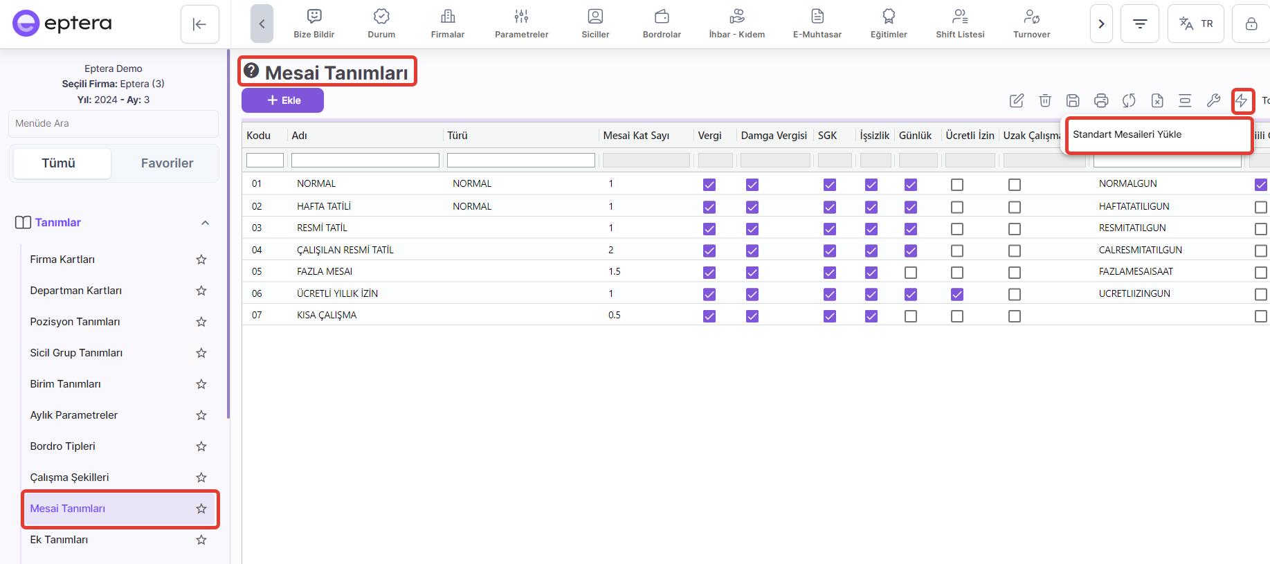 Standart mesaileri yükle butonu ile yüklenir. Mesai katsayısı, vergi, damga vergisi, SGK ve fiili çalışma gibi tabi olunan parametre aktif edilerek kaydedilir. Yeni bir mesai tanımı eklemek için açılan satıra ilgili mesai tanımının adı, tabi olduğu parametreler (katsayı, vergi, dv, sgk vb.) seçilerek kaydedilir.