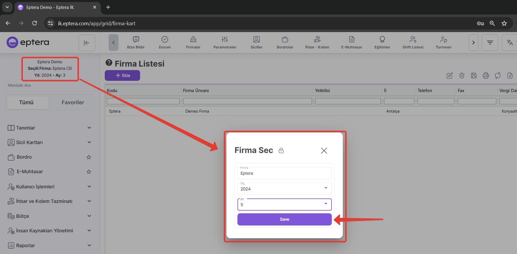 Sol üst menüden çalışmak istenilen firma ve çalışmak istenen dönem ve ay seçilir.