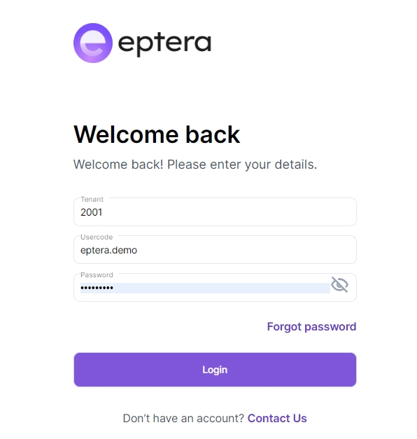 Web tarayıcımıza https://ik.eptera.com adresi girilerek, açılan pencerede Tenant (Hotel ID) Usercode (Kullanıcı Kodu) ve Password (Kullanıcı Şifresi) doldurularak Login (Giriş) butonuna basarak giriş yapılır.
